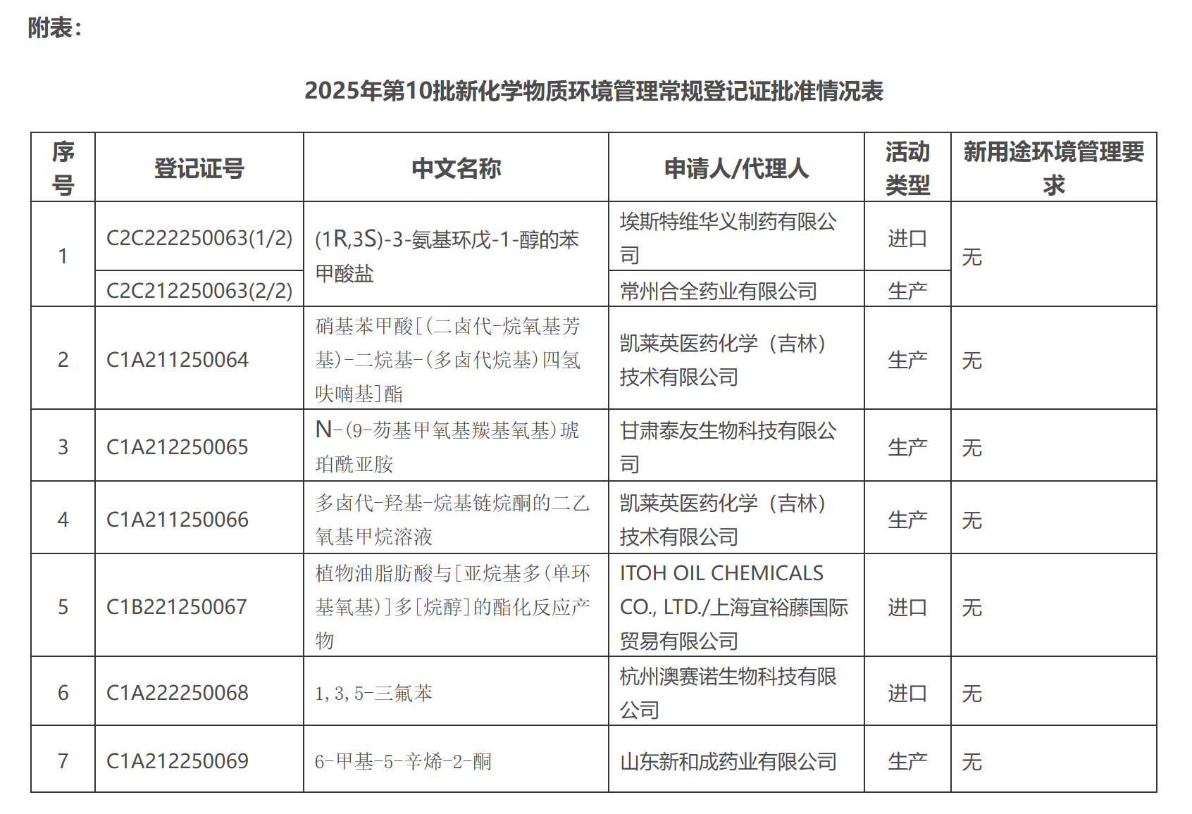 生態環境部:2025年第10回新化学物質環境管理常規登記証の審査結果を公示 中国生態環境部は、 2025年12月4日、「2025年第10回新化学物質環境管理常規登記証の審査結果の公開」を自身のウェブサイト上に掲載しました。 今回公開の物質は、新規申請案件が7件です。 なお、以下のリンクより詳細がご覧になれます。 https://www.mee.gov.cn/ywgz/gtfwyhxpgl/hxphjgl/xhxwz/202512/t20251204_1137080.shtml